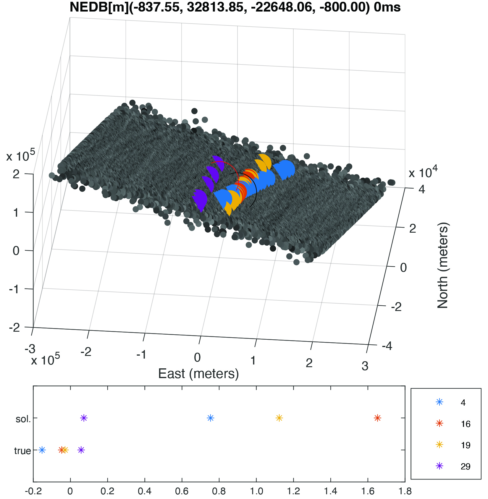 To determine the search space for the DPE, we first determine the location along the original TRACE-estimated trajectory with the minimum RMSE of range rates for each segment. Then we propagate the state (position and velocity) at the minimum location to the Segment 6 time stamp. If the time segment has more than three observed range rates (Segment 6 and Segment 12), we perform a least squares velocity estimate using the range-rate measurements, using the locations along the trajectory and selecting the location with the smallest RMSE. Then, for Segment 12, the position and velocity obtained from least squares is propagated backwards in time to the Segment 6 timestamp. All of these points along the trajectory as well as the original point from the TRACE estimated trajectory are used in a way similar to the method of using a sigma point filter. Specifically, the mean and covariance of the position and velocity values are used to sample a Gaussian distribution. This distribution will serve as the first iteration of the candidate locations for DPE. There were a total of three iteration steps and at each iteration the range of clock bias values over which to search was refined from a spacing of 1,000 meters, 100 meters, and 10 meters. Also on the third iteration, the sampled Gaussian distribution was resampled with 1,000 times the covariance matrix values in the directions perpendicular to the direction to Earth. This was done to gain better insight into the GPS satellites that were contributing to the DPE solution.