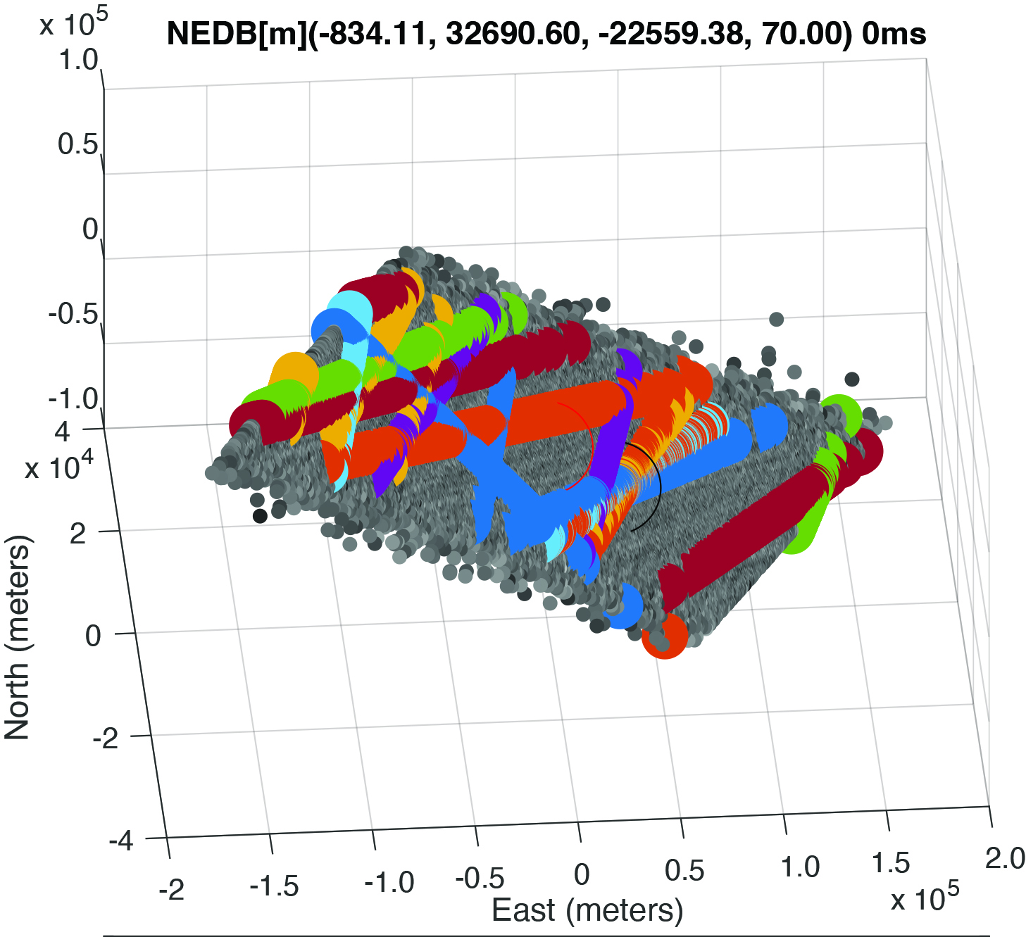 For the final iteration, Figures 9 and 10 depict the solutions with the 10-meter clock bias spacing and the approach of spreading the search space over the dimension perpendicular to the direction of Earth. Again, this was done to illustrate how the peak correlations appear to be drawing close to a single intersection location. However, the results fall short of the type of results shown in the spatial correlogram previously depicted in Figure 2 when many satellite signals were detected.