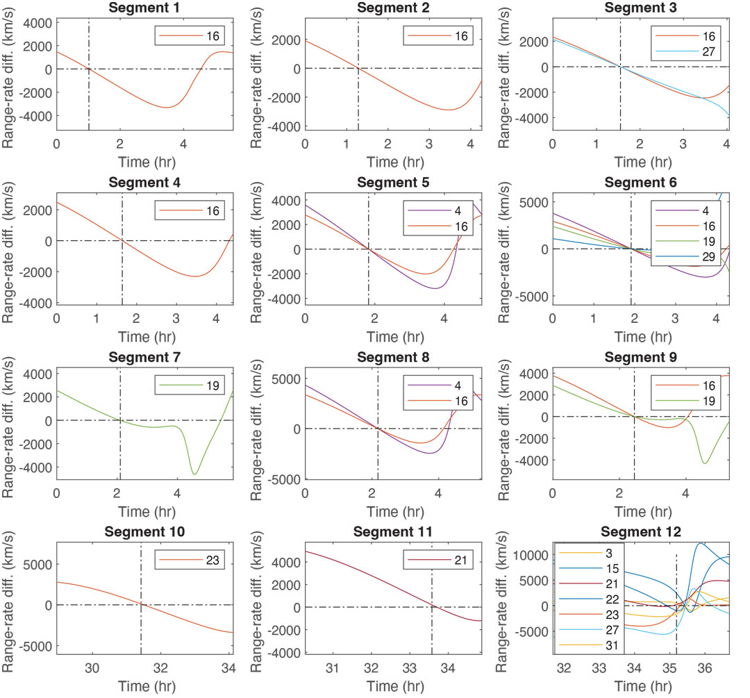 These results are used to direct our investigations to regions of the dataset to parameterize our orbit track in a way to effectively search our delay and Doppler correlograms to populate our spatial correlograms within the DPE. Figure 6 shows the time history of the difference of predicted range rates on the trajectory and the detected range rates on the trajectory. That is, a constant detected range rate value is subtracted from a changing range rate for the duration of the trajectory and not just at the location on the trajectory at the detect time (dashed vertical line). From this we can see that the TRACE method gives range rates near the detected ranges at the approximate detection time for the 12 different segments.