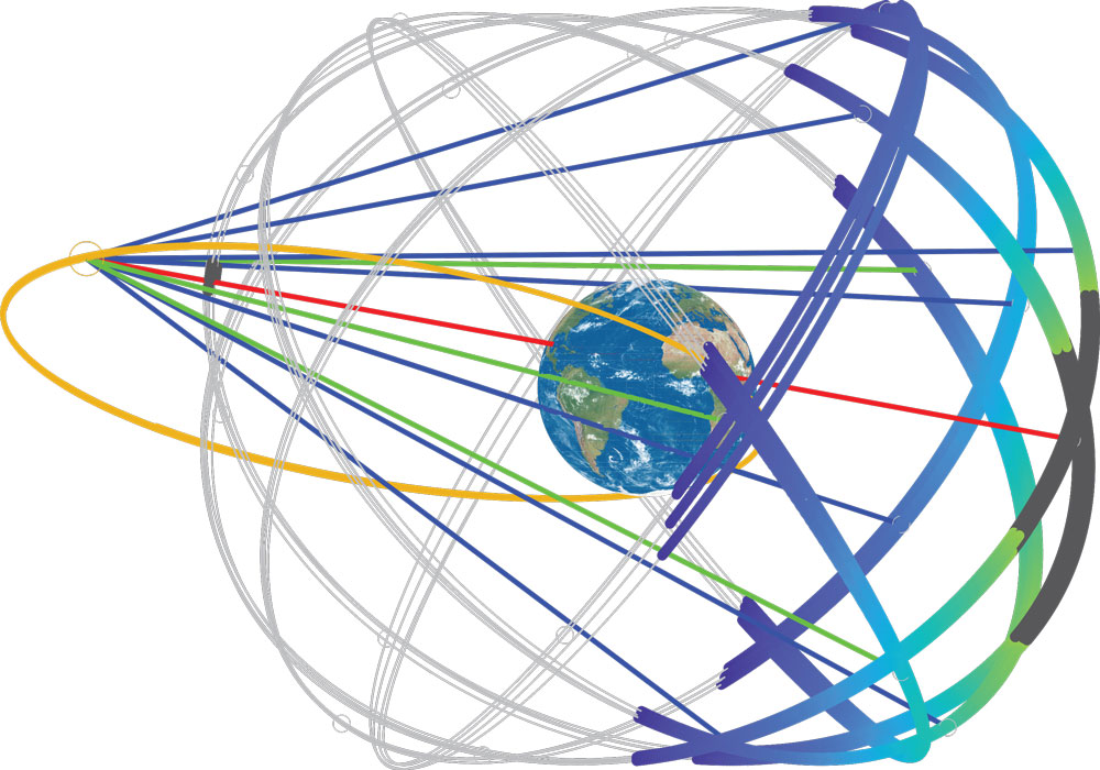 The positions of the GPS satellites are calculated using broadcast messages (combined into so-called BRDC files) and International GNSS Service (IGS) precise orbit data products (SP3 files). GPS satellites broadcast signals containing their orbit details and timing information with respect to an atomic clock. Legacy GPS signals broadcast messages contain 15 ephemeris parameters, with new parameters provided every two hours. The IGS supports a global network of more than 500 ground stations, whose data is used to precisely determine the orbit (position and velocity in an Earth-based coordinate system) and clock corrections for each GNSS satellite. These satellite positions, along with the one calculated for the Falcon Gold satellite, allowed for the simulation of visibility conditions. In other words, by determining points along the Falcon Gold satellite trajectory, we determine whether the vehicle will be within the 50° beamwidth of a GPS satellite that is not blocked by Earth.