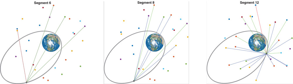 Figure 3 shows a plot rendering of the visibility conditions of the Falcon Gold satellite at a location along its orbit to the GPS satellite tracks. Figure 4 depicts three of the 12 segments where signals were detected and compares the predicted visibility to the satellites that were actually detected. A GPS satellite is predicted to be visible to the Falcon Gold satellite if the direct line-of-sight (DLOS) is not occluded by Earth and if the DLOS is within 25° of the GPS antenna boresight (see Figure 5).