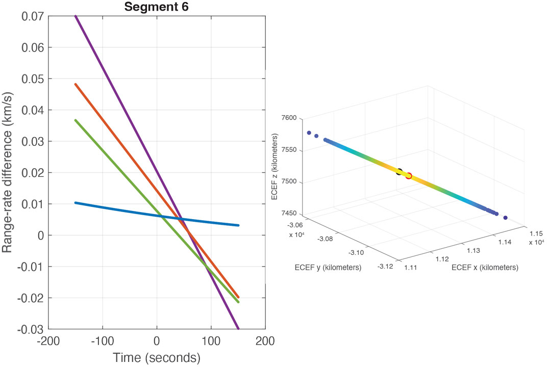 Excluding Segment 12, which was below the MEO constellation altitude, Segment 6 has more detected range rates than that of the other segments. On closer inspection of this segment, and using IGS precise orbit data products, it appears that the minimum RMSE of the range rates from the detected PRNs is off from the reported detection time by several seconds (see Figure 7). Investigating regions along the Falcon Gold TRACE-estimated trajectory and assuming a mismatch in time tagging results in a location (in Earth-centered Earth-fixed coordinates) with a lower RMSE for the predicted range rates compared to detected range rates.