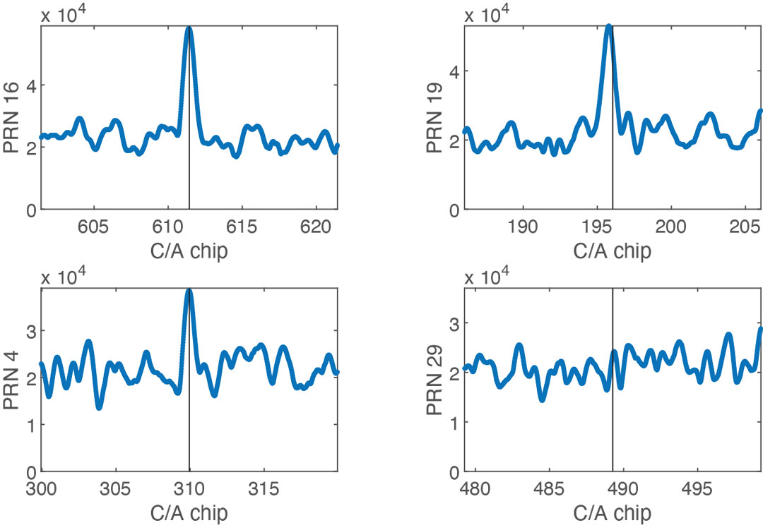 Figure 8 shows the correlation peaks for each of the signals reported to be detected using a 15-millisecond non-coherent integration time within the DPE acquisition. Satellite PRNs 4, 16 and 19 are clearly detected. Satellite PRN 29 is less obviously detected, but the maximum correlation value is associated with the reported detected frequency. However, this is the peak detected frequency only if the Doppler search band is narrowly selected around the reported detected frequency. Similarly, while the peak code delay shows a clear acquisition peak for PRNs 4, 16 and 19, for PRN 29 the peak value for code delay is more ambiguous with many peaks of similar magnitude of correlation power. Figure 8 depicts the regions around the max peak correlation chip delay.