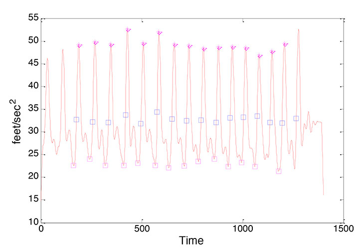Generating the catalog of stored information is an offline task that begins by “segmenting” recorded IMU time domain data into individual steps. An example of the output of the segmentation process is shown in Figure 4.