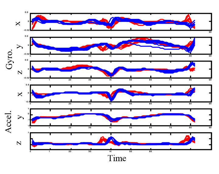 Figure 5 displays the segmentation results for two different walking styles (in red and blue) across approximately 15 example steps. As is evident from the graph, walking has characteristics that are common across users, for example, the sharp peaks in the z-axis acceleration caused by foot-ground impacts. Once the data has been segmented, a wavelet transformation on each data channel is performed. Wavelet transformation for many users over many different motion types takes place offline. Subsequently, a wavelet descriptor is built for each motion type based on the transformations into the wavelet domain. With this method, a wide variety of information (that is, descriptors) suitable for input to a classifier is captured about each motion. These descriptors are then cataloged and stored in memory on the ePINS device.