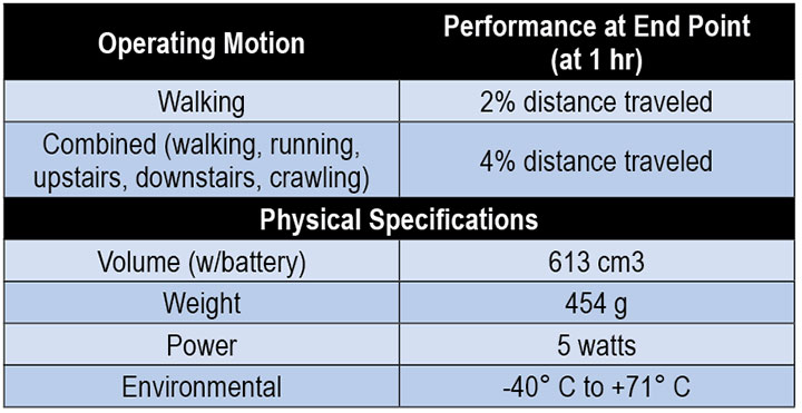 The ePINS demonstration device can achieve path performance of less 2 percent distance traveled for walking motion after 1 hour of operation, independent of the magnetic environment. Current performance, packaging characteristics, and interfaces are summarized in Table 1.
