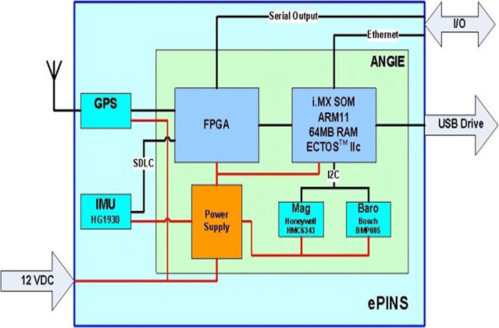 The ePINS processing platform uses Honeywell Agile Navigation and Guidance Integrated Electronics support electronics. It includes a Honeywell HG1930 MEMS IMU, a Bosch Sensortec BMP085 barometric pressure sensor, a Honeywell HMC6343 digital magnetometer, and a NovAtel OEMStar GPS receiver.