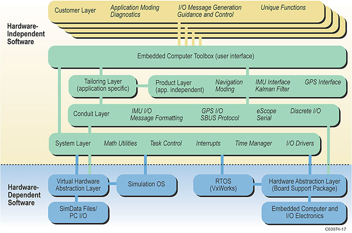 The ePINS software system is shown in Figure 2. The navigation software runs within Honeywell’s Embedded Computing Toolbox and Operating System (ECTOS IIc), which provides a layered, customizable, and reusable software architecture for implementing navigation, guidance, and control software. A Honeywell-developed simulation tool for offline analysis and development of ECTOS-based software was also used in ePINS development and testing.