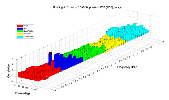 Finally, for the online phase, the wavelet descriptor of the incoming IMU data is calculated by performing a wavelet transformation on each data channel. This descriptor is then compared to the pre-computed and stored descriptors to classify the motion. FIGURE 7 shows an example of the motion classifier output, where a running motion was used as an input. The classifier successfully determined the motion type (blue field), frequency and phase of the input motion, depicted by the tallest rectangle in the figure.