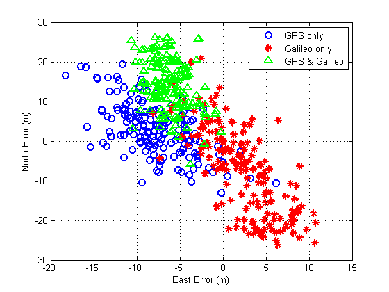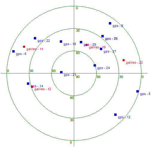 Figure 2 shows the positions of the four Galileo satellites and of 12 GPS satellites at time of acquisition, while Figure 3 reports the acquisition results of the four Galileo IOV satellites.