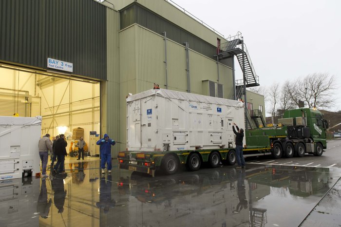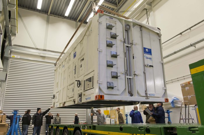 The satellite was carried by lorry from its manufacturer in Germany, cocooned within an environmentally controlled container. It arrived inside ESTEC’s cleanroom environment on Dec. 18. The container was then opened up to begin preparations for testing.