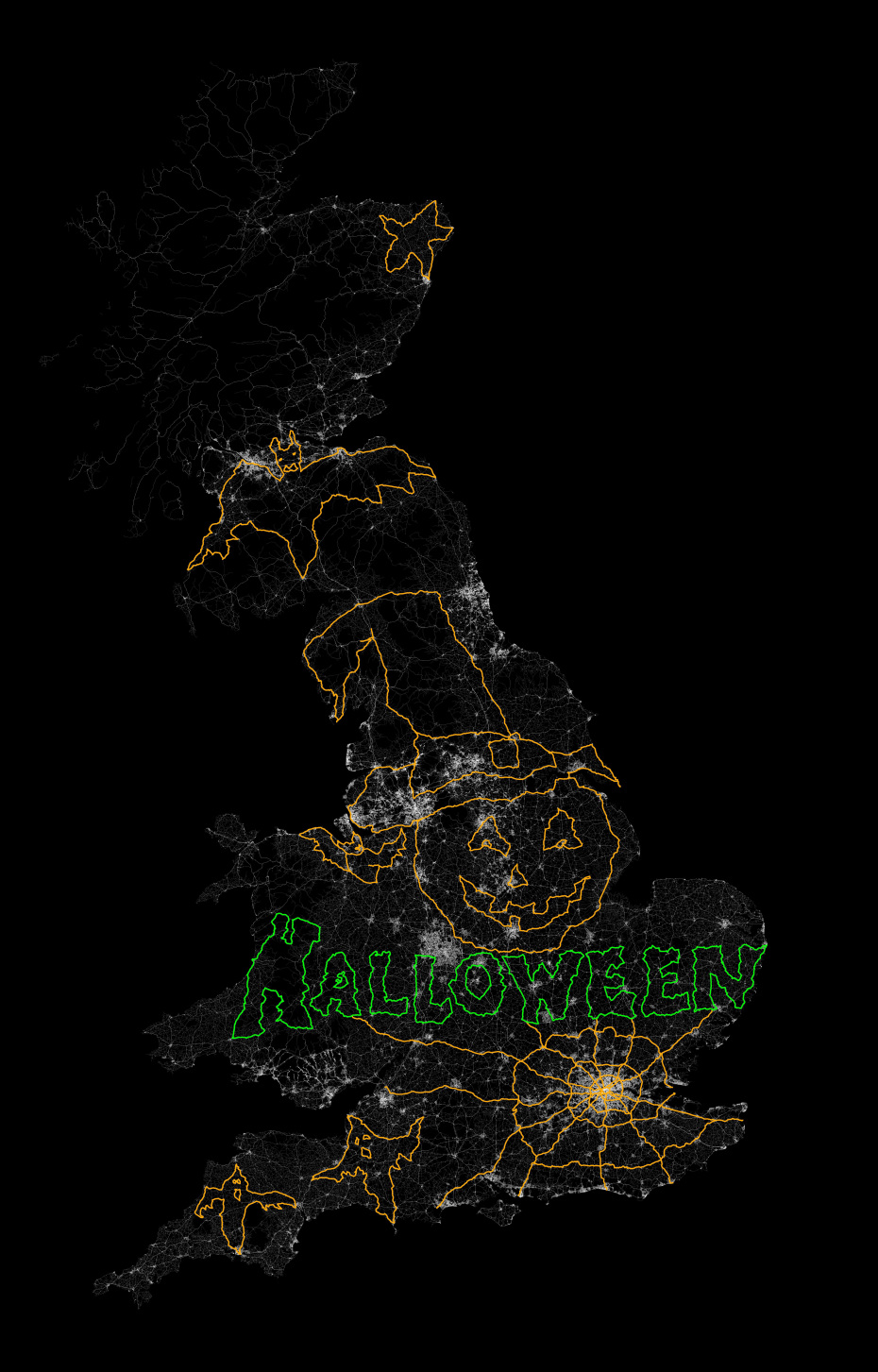In October, Jeremy Wood drove all over the United Kingdom to create a Halloween message, reports Metro. Wood drove a 10,000-mile, painstakingly-plotted route through England, Wales and Scotland in a Vauxhall Corsa, plotting a 264,000 positions on the car’s GPS. Wood linked the positions on a virtual drawing to create a picture that shows bats, ghosts, a spider web, and a pumpkin in a witch’s hat, with the word “Halloween” underneath. The result is the image below.