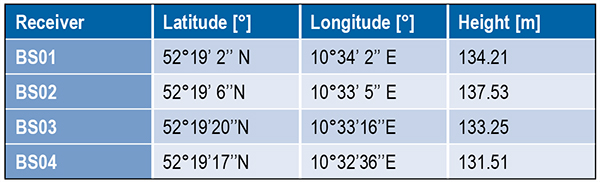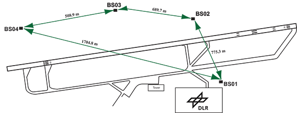 DLR has set up a GBAS prototype at the research airport in Braunschweig (ICAO identifier EDVE) near the DLR research facility there. This ground station has recently been updated and now consists of four GNSS receivers connected to choke ring antennas, which are mounted at heights between 2.5 meters and 7.5 meters above equipment shelters. All four receivers are capable of tracking GPS L5 (in addition to GPS L1 and L2 semi-codeless) and Galileo E1 and E5a signals. Figure 1 gives an overview of the current ground station layout, and Table 1 gives the coordinates of the antennas.