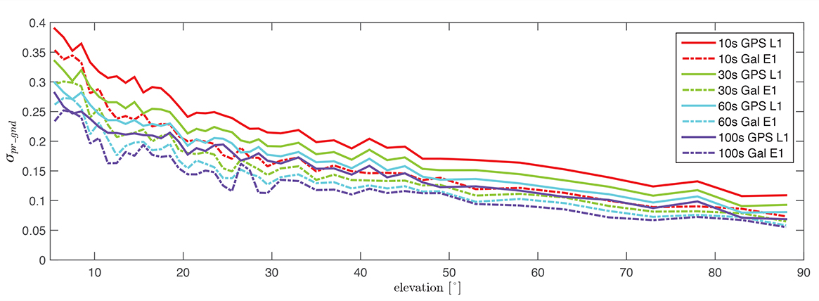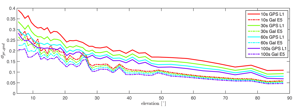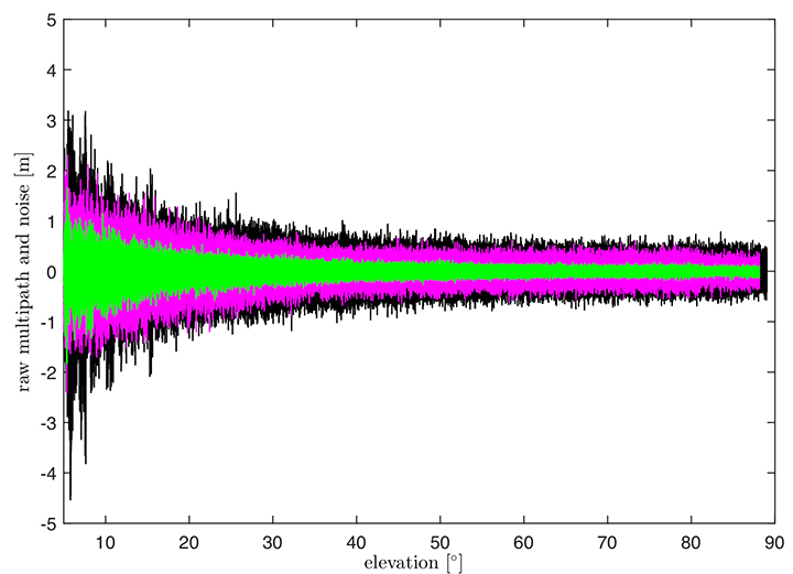 The curves there show the ratios of the standard deviations for each elevation bin. The values for GPS L1 are almost 1.5 times larger than those for Galileo E1 BOC(1,1) (green curve) for elevations below 20°. For high elevations, the ratio approaches 1.0. This corresponds to the observations in the raw multipath plot ( Figure 2). With the same signal modulation and the same chip rate, E5a and L5 have very similar results (red curve), and the ratio stays close to 1.0 for all elevations.
