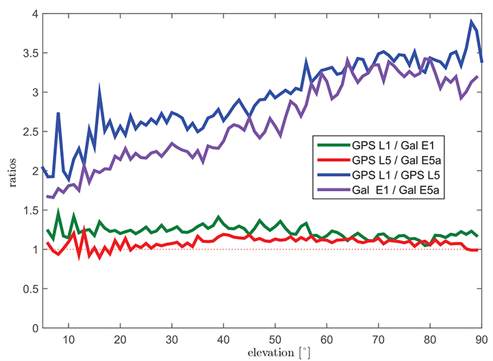 The blue and the purple curves in Figure 3 show the ratio of GPS L1 C/A (BPSK(1)) and GPS L5 (BPSK(10)), and Galileo E1 (BOC(1,1)) and Galileo E5a (BPSK(10)), respectively. The ratio of GPS L1 to GPS L5 (blue curve) increases with elevation from values around 2.5 for low elevations, reaching values above 3.5 for elevations higher than 60°. As Galileo E1 performs better, the ratio between Galileo E1 and Galileo E5a (purple curve) is smaller, from a value of 1.5 for elevations below 10 degrees to a value of 3.0 for high elevations.
