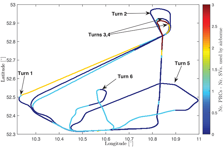 Figure 6 shows the ground track of a recent flight trial conducted by DLR in November 2014. The colors represent the difference between the number of satellites used by the ground subsystem (with available corrections) and the number of satellites used by the airborne subsystem in the GAST-D position solution. One of the purposes of the flight was to characterize the loss of satellite signals in turns. In turns with a steeper bank angle, up to 3 satellites are lost (Turns 1, 3, and 4), while on a wide turn with a small bank angle (Turn 2), no loss of satellite lock occurred. It is also possible for airframe to block satellite signals, leading to a different number of satellites between ground and airborne even without turns.