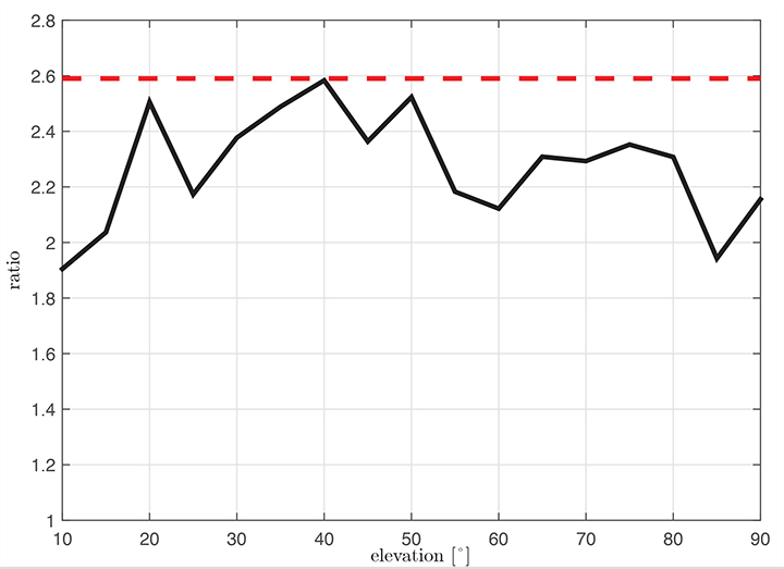 Figure 7 shows the ratio σIfree/σL1 using measured data. We observe that the measured ratio (the black curve) is below the theoretical ratio computed based on the assumption of statistically independent samples (the constant value of 2.59). This is explained by the fact that the multipath errors in the measurements are not independent but have some degree of statistical correlation. The standard deviations are computed based on the same data set used in the raw multipath and noise assessment using 100-second smoothed measurements sorted into elevation bins of 10° spacing.