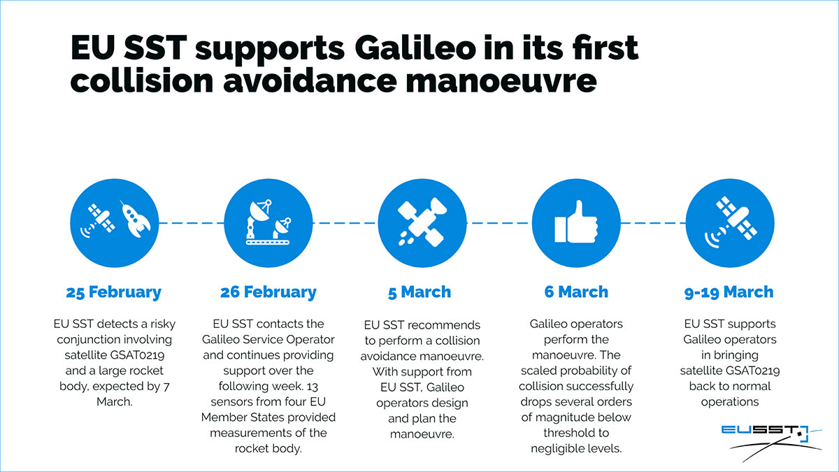 On Feb. 25, the Galileo Service Operator (GSOp) received from EUSST a collision risk alert between GSAT0219 and an inert Ariane 4 upper stage launched in 1989. Following the warning, GSOp closely monitored the risk, in close cooperation with EUSST that was refining its predictions.