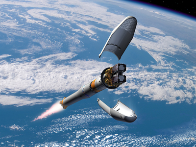 The two Galileo In-Orbit Validation satellites are protected during their launch by Soyuz by a launch fairing. Once the Soyuz has passed most of the way through the atmosphere, this fairing can then be ejected.