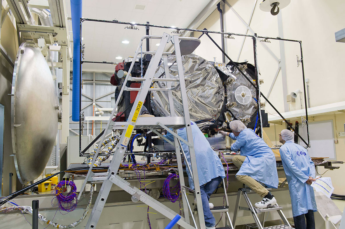 The first of the two satellites is now midway through a five-week immersion in vacuum and temperature extremes that mimic the conditions it faces in space. This thermal-vacuum test takes place inside a 4.5-meter diameter stainless-steel vacuum chamber called Phenix. An inner box called the thermal tent has sides that are heated to simulate the Sun’s radiation or cooled down by liquid nitrogen to create the chill of Sunless space.