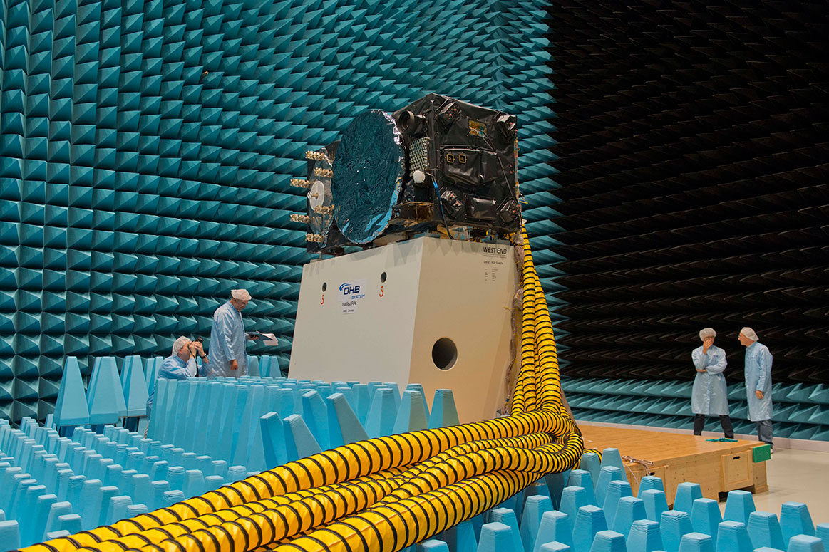 September saw the second satellite undergo acoustic testing in the Large European Acoustic Facility, LEAF, effectively the largest sound system in Europe. The first satellite submitted to this trial just a few weeks before. A quartet of noise horns are embedded in one wall of this 11-meter-wide, 9-meter-deep and 16.4-meter-high chamber, generating sound by passing nitrogen gas through the horns, surpassing 140 decibels.
