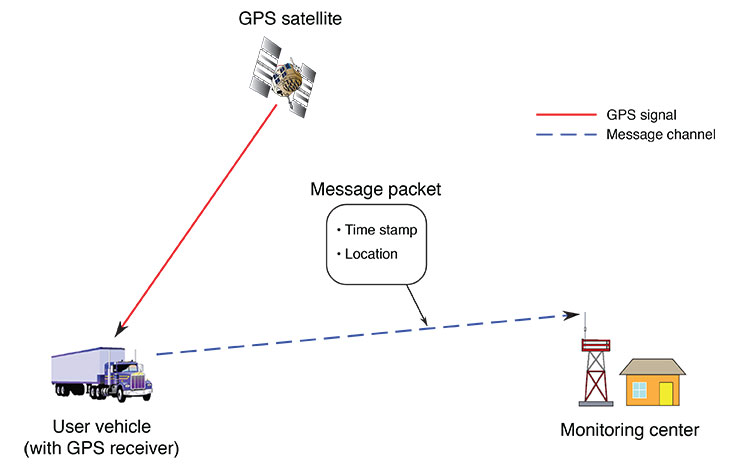 For illustrative purposes, we will focus on the terrestrial application of cargo tracking. Most of the commercial fleet and asset tracking systems available in the market today depend on a GPS receiver installed on the cargo or asset. The GPS receiver provides real-time location (and, optionally, velocity) information. The location and the time when the asset was at a particular location form the tracking message, which is sent back to a monitoring center to verify if the asset is traveling in an expected manner. This method of tracking is depicted graphically in FIGURE 1.