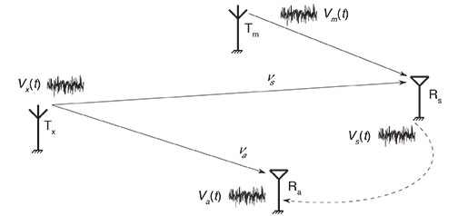 A white-noise process that is superimposed on the GPS signal would be a perfect watermark signal in the sense that it is impossible reproduce and predict. FIGURE 2 is an abstraction that shows how the above idea of a superimposed white-noise process would work in the signal authentication problem. The system has one transmitter, Tx , and two receivers, Rs and Ra. Rs is the supplicant and Ra is the authenticator. The task of the authenticator is to determine whether the supplicant is using a signal from Tx or is being spoofed by a malicious transmitter, Tm. Ra is the trusted source, which gets a copy of the authentic signal, Vx(t) (that is, the signal transmitted by Tx). The snapshot signal, Vs(t), received at Rs is sent to the trusted agent to compare with the signal, Va(t), received at Ra. Every time a verification is performed, the snapshot signal from Rs is compared with a piece of the signal from Ra. If these two pieces of signal match, we can say the snapshot signal from Rs was truly transmitted from Tx. For the white-noise signal, match detection is accomplished via a cross-correlation operation (see Further Reading). The cross-correlation between one white-noise signal and any other signal is always zero. Only when the correlation is between the signal and its copy will the correlation have a non-zero value. So a non-zero correlation means a match. The time when the correlation peak occurs provides additional information about the distance between Ra and Rs.