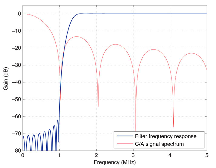 FIGURE 4 is the frequency response of a high-pass filter designed to filter out the C/A signal energy. The spectrum of the C/A signal is also plotted in the figure. The high-pass filter only removes the main lobe of the C/A signals. Unfortunately, the high-pass filter also attenuates part of the P(Y) signal energy. This degrades the auto-correlation peak of the P(Y) signal. Even though the gain of the high-pass filter is the same for both the C/A and the P(Y) signals, this effect on their auto-correlation is different. That is because the percentage of the low-frequency energy of the C/A signal is much higher than that of the P(Y) signal. This, however, is not a significant drawback as it may appear initially. To see why this is so, note that the objective of the high-pass filter is to obtain the greatest false-peak rejection ratio defined to be the ratio between the peak value of P(Y) auto-correlation and that of the C/A auto-correlation. The false-peak rejection ratio of the non-filtered signals is 0.5. Therefore, all one has to do is adjust the cut-off frequency of the high-pass filter to achieve a desired false-peak rejection ratio.