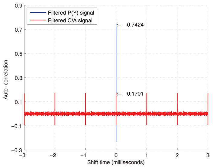 FIGURE 5. Auto-correlation of the filtered C/A and P(Y) signals.