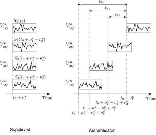 The situation shown in Figure 6 is very similar to double-difference differential GPS. The major difference between what is shown in the figure and the traditional double difference is how the differential ranges are calculated. Figure 6 shows how the range information can be obtained during the signal authentication process. Let us assume that the authenticator and the supplicant have four common GPS satellites in view: SAT1, SAT2, SAT3, and SAT4. The signals transmitted from the satellites at time t are S1(t), S2(t), S3(t), and S4(t), respectively. Suppose a signal broadcast by SAT1 at time t0 arrives at the supplicant at t0 + ν1s where ν1s is the travel time of the signal. At the same time, signals from SAT2, SAT3, and SAT4 are received by the supplicant. Let us denote the travel time of these signals as ν2s, ν3s, and ν4s, respectively. These same signals will be also received at the authenticator. We will denote the travel times for the signals from satellite to authenticator as ν1a, ν2a, ν3a, and ν4a. The signal at a receiver’s antenna is the superposition of the signals from all the satellites. This is shown in FIGURE 7 where a snapshot of the signal received at the supplicant’s antenna at time t0 + ν1s includes GPS signals from SAT1, SAT2, SAT3, and SAT4. Note that even though the arrival times of these signals are the same, their transmit times (that is, the times they were broadcast from the satellites) are different because the ranges are different. The signals received at the supplicant will be S1(t0), S2(t0 + ν1sν2s), S3(t0 + ν1sν3s), and S4(t0 + ν1sν4s). This same snapshot of the signals at the supplicant is used to detect the matched watermark signals from SAT1, SAT2, SAT3, and SAT4 at the authenticator. Thus the correlation peaks between the supplicant’s and the authenticator’s signal should occur at t0 + ν1a, t0 + ν1sν2s + ν2a, t0 + ν1sν3s + ν3a, and t0 + ν1sν4s + ν4a.