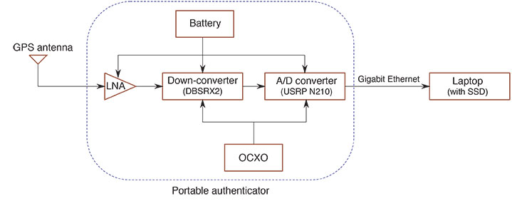 The GPS position authenticator uses an Ettus Research LLC model USRP N210 software-defined radio with a DBSRX2 RF daughterboard.
