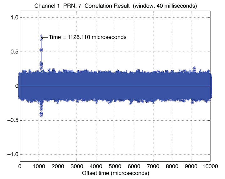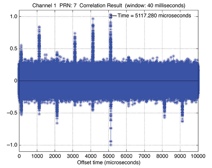The C/A signal energy in the GPS signal is about double the P(Y) signal energy. So the C/A false peaks are higher than the true peak. The C/A false peaks repeat every 1 millisecond. If the C/A false peaks occur, they are greater than the true peak in both number and strength. Because of background noise, it is hard to identify the true peak from the correlation result corrupted by the C/A residuals.