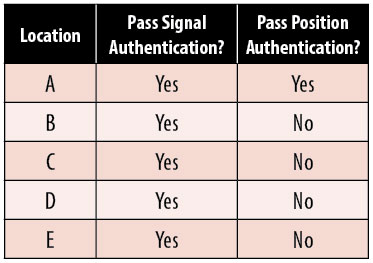 • The signal contained the watermark. We call this the “signal authentication test.” It determines whether a genuine GPS signal is being used to form the supplicant’s position report.
