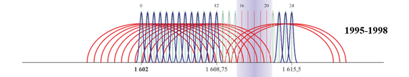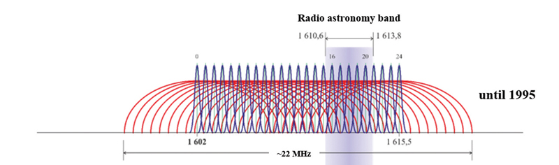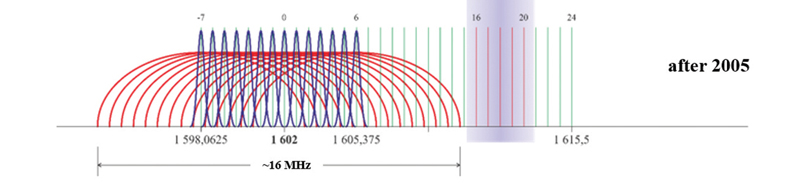 In 1995, the Russian Federation assumed obligations to protect the band used in radio astronomy in the search for extraterrestrial life. At the first stage (until 1998), the broadcast of the navigation signals in the carrier frequency channels 16-20 was terminated and the frequency channels 13, 14, 20 and 21 were used under exceptional circumstances (Figure 2). Then, all newly launched satellites transmitted the signals only in the frequency channels 0-12. By 2005, the total bandwidth of GLONASS satellites was reduced to 16.97 MHz in L1 band and 15.47 MHz in L2 band respectively (Figure 3).