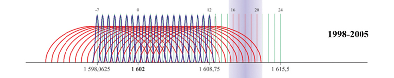 Starting in 2005, GLONASS satellites have been using the frequency channels from -7 to +6 (Figure 4) to broadcast frequency division multiple access (FDMA) navigation signals. As a result, the upper limit of the GLONASS signal bandwidth in the L1 band dropped from 1620.61 to 1610.485 MHz and the lower limit went down from 1596.89 to 1592.953 MHz. The signal bandwidth in L2 band changed similarly.