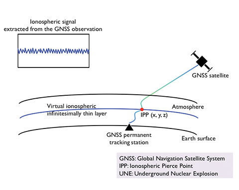 Atmospheric effects from mostly atmospheric nuclear explosions have been studied since the 1960s.The ionospheric delay in GNSS signals observed by the ground stations can be processed into total electron content (TEC), which is the total number of electrons along the GNSS signal’s path between the satellite and the receiver on the ground. The TEC derived from the slant signal path, referred to as the slant TEC (STEC), can be observed and analyzed to identify disturbances associated with the underground nuclear explosion.