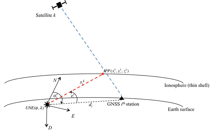The initial assumption in our work was to use a constant propagation velocity of a TID. By observing the time of TID arrival at the ionospheric pierce point (IPP), the travel distance from the epicenter to the IPP of the GPS station that detected a TID (which is the slant distance from the ith station and the kth satellite) can be derived using a relationship with the propagation velocity. In this study, we defined a thin shell in the ionosphere F layer, 300 kilometers above the surface, and computed the IPP location for each GPS signal at the corresponding time epoch of TID detection.