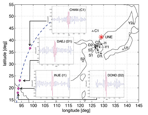 Figure 3 illustrates the concept of the generation of the acoustic gravity wave by a UNE event, and its propagation through the ionosphere that results in a traveling ionospheric disturbance (TID). The primary points of our approach are: (1) STEC is calculated from dual-frequency GPS carrier phase data, (2) after eliminating the main trend in STEC by taking the numerical third order horizontal 3-point derivatives, the TIDs are isolated, (3) we assume an array signature of the TID waves, (4) we assume constant radial propagation velocity, vT, using an apparent velocity, vi, of the TID at the ith observing GNSS station, (5) since the TID’s velocity is strongly affected by the ionospheric wind velocity components, vN and vE, in the north and east directions, respectively, the unknown parameters,vT, vN, and vE, can be estimated relative to the point source epicenter, and (6) if more than six GNSS stations in good geometry observe the TID in GNSS signals, the coordinates of the epicenter can also be estimated.