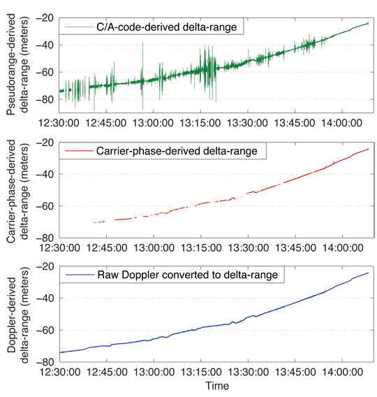 Doppler Frequency Shift. While carrier-phase tracking can be discontinuous in the presence of continuous pseudoranges, a receiver generates continuous Doppler-frequency-shift measurements. The Doppler measurements are immune to cycle slips. Moreover, the precision of the Doppler measurements is better than the precision of pseudoranges because the absolute multipath error of the Doppler observable is only a few centimeters. Thus, devising methods that utilize the precision of raw Doppler measurements to reduce the receiver noise and high-frequency multipath on pseudoranges may prove valuable especially in GNSS-challenged environments. Figure 2 shows an example of the availability and the precision of the receiver-generated Doppler measurements alongside the delta-range values derived from the C/A-code pseudoranges and from the L1 carrier-phase measurements. This figure also shows that frequent carrier-phase outages and anomalies occur while for every C/A-code pseudorange measurement there is a corresponding Doppler measurement available.