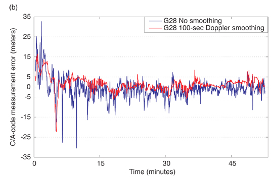 Doppler-Smoothing. Before we present the improvement in the performance of instantaneous RTK positioning, the effect of the Doppler-smoothing of the pseudoranges in the measurement domain and comparison with carrier-phase smoothing of pseudoranges is given. To do this, we computed the C/A-code measurement errors or observed range deviations (the differences between the expected and measured pseudoranges) in the static mode (with surveyed known coordinates) using raw, Doppler-smoothed and carrier-smoothed pseudoranges. FIGURE 3a illustrates the effect of 100-second Hatch-filter carrier smoothing and FIGURE 3b shows a 100-second Doppler-smoothing of the pseudoranges for satellite PRN G28 (RINEX satellite designator) with medium-to-high elevation angle. The raw observed pseudorange deviations (in blue) are also given as reference. The quasi-sinusoidal oscillations are characteristic of multipath. Comparing the Doppler-smoothing in Figure 3b to the Hatch carrier-smoothing in Figure 3a, it can be seen that Doppler-smoothing of pseudoranges offers a modest improvement and is more robust and effective than that of the traditional Hatch filter in difficult environments.