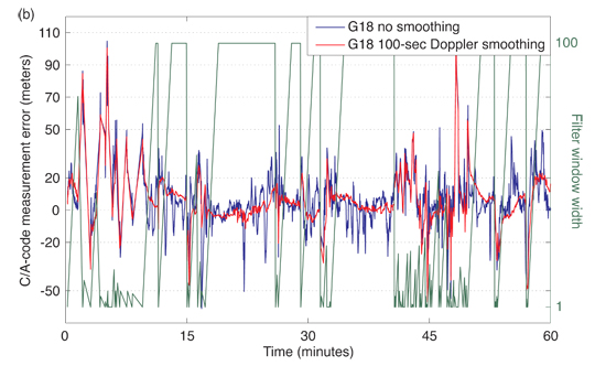 Motivated both by the continual availability and the centimeter-level precision of receiver-generated (raw) Doppler measurements, even in urban canyons, a method has been introduced by the authors that utilizes the precision of raw Doppler measurements to reduce the receiver noise and high-frequency multipath on code pseudoranges. For more detail on the Doppler-smoothing technique, see Further Reading. The objective is to smooth the pseudoranges and push the accuracy of the code-based or both code- and carrier-based positioning applications in GNSS-challenged environments.