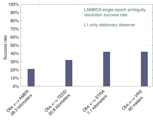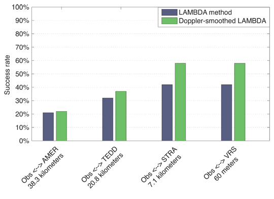 The overall performance of the single-epoch single-frequency integer ambiguity resolution obtained by the conventional LAMBDA ambiguity resolution method without Doppler-aiding is shown in Figure 5 for baselines from 60 meters up to 38 kilometers in length. In comparison, the performance of the single-epoch single-frequency integer ambiguity resolution from the LAMBDA method using Doppler-smoothed pseudoranges are shown in Figure 6 for those baselines and they are compared with integer ambiguity resolution success rates of the conventional LAMBDA ambiguity resolution method without Doppler-aiding. Figure 6 shows that using Doppler-smoothed pseudoranges enhances the probability of identifying the correct set of integer ambiguities and hence increases the success rate of the integer ambiguity resolution process in instantaneous RTK, providing higher availability. This is more evident for shorter baselines. For long baselines, the residual of satellite-ephemeris error and atmospheric-delay residuals that do not cancel in double differencing potentially limits the effectiveness of the Doppler-smoothing approach. It is well understood that those residuals for long baselines strongly degrade the performance of ambiguity resolution. Relative kinematic positioning with single frequency mass-market receivers in urban areas using VRS has also shown improvement.