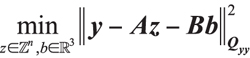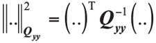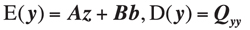 where E(y) is the expected value and D(y) is the dispersion of y. The vector of observed-minus-computed double-difference carrier-phase and code observations is given by y; z is the vector of unknown ambiguities expressed in cycles rather than distance units to maintain their integer character; b is the baseline vector, which is unknown for relative navigation applications but for which the length in attitude determination is generally known; A is a design matrix that links the data vector to the vector z; and B is the geometry matrix containing normalized line-of-sight vectors. The variance-covariance matrix of y is represented by the positive definite matrix Qyy, which is assumed to be known.