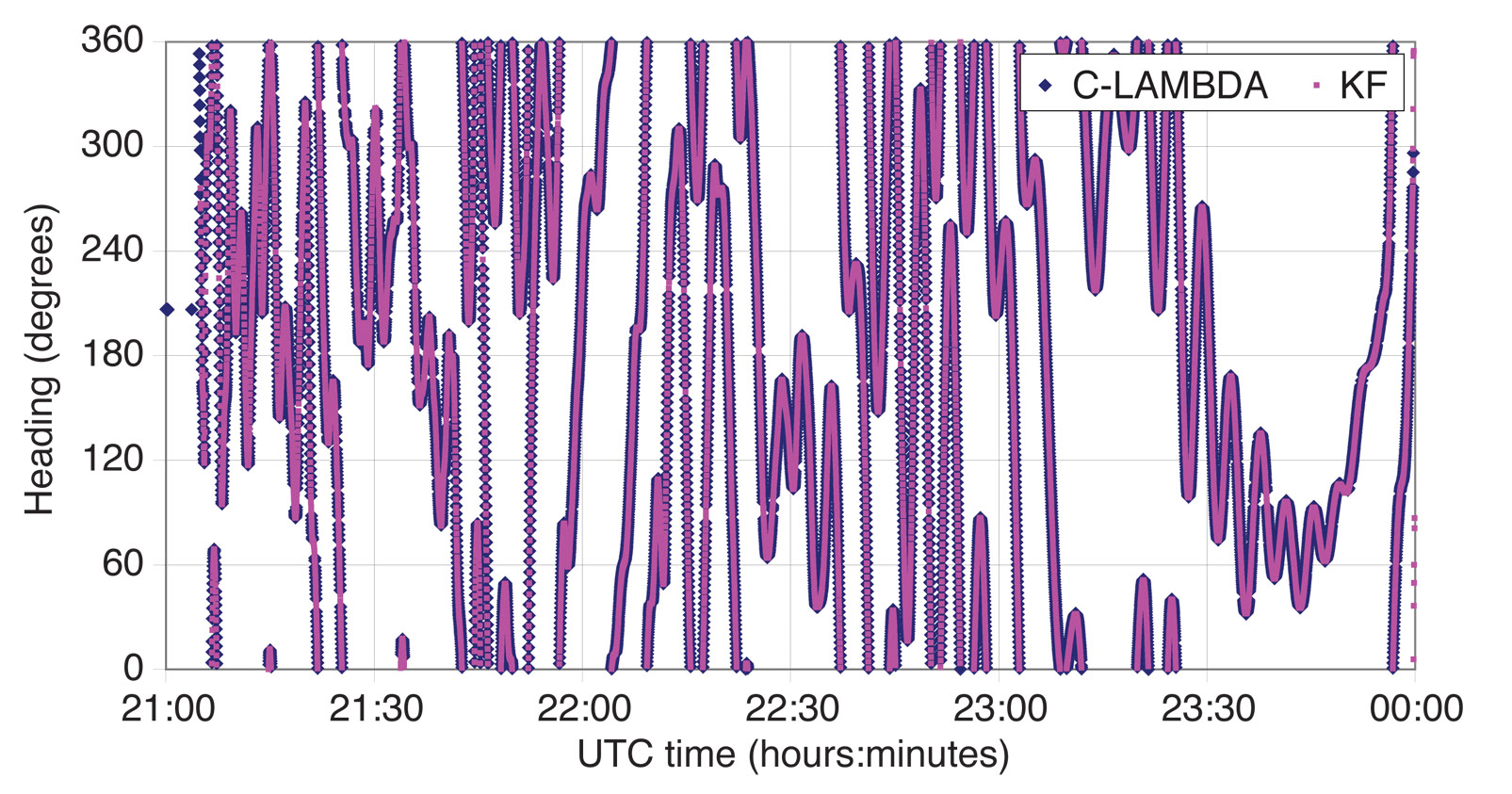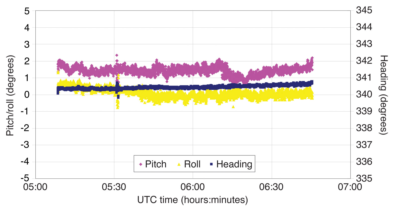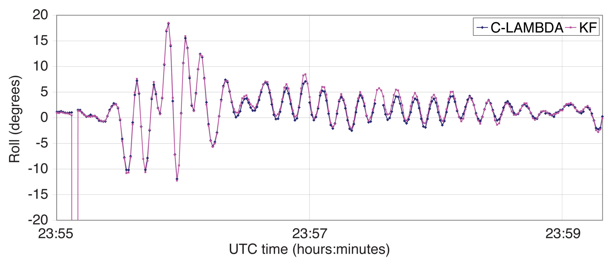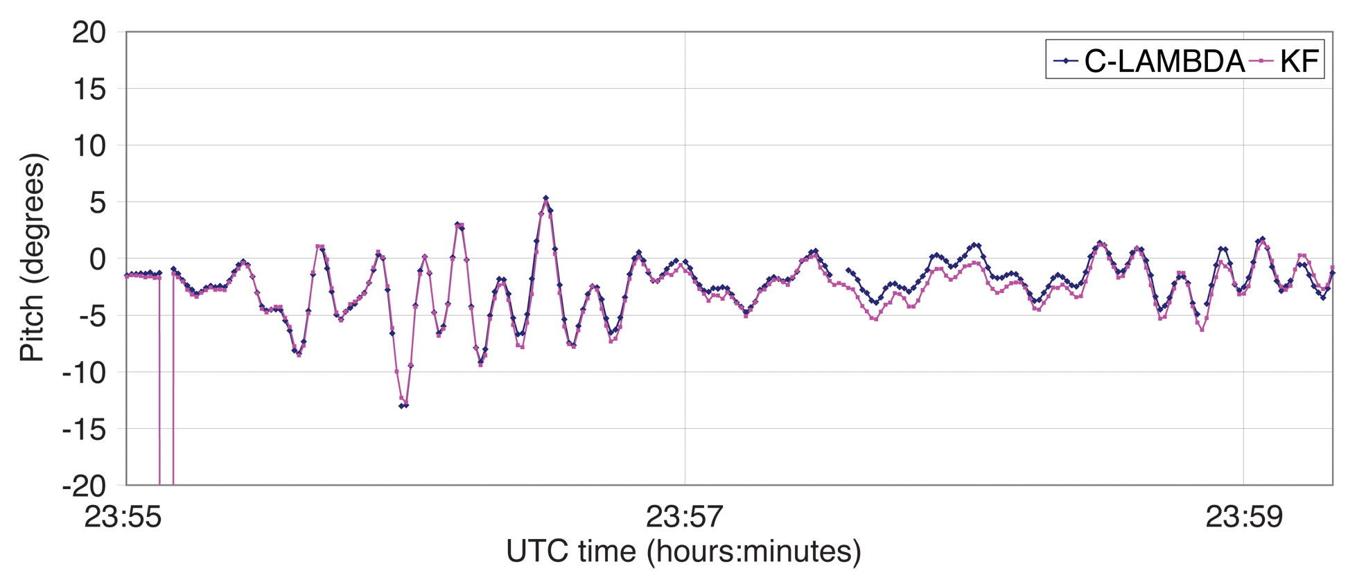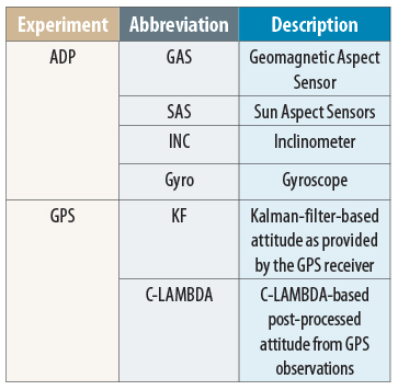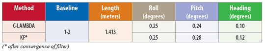 Onboard Attitude Determination. In this article, we also use the onboard estimate of the attitude as provided by the multi-antenna receiver. The method applied in the receiver is based on a Kalman filter and the ambiguities are resolved by the standard LAMBDA method. The baseline length, if the information is provided to the receiver a priori, is used to validate the results. For baseline lengths of about 1 meter, the receiver’s pitch and roll accuracy is about 0.60 degrees, and heading about 0.30 degrees according to the receiver manual. We will refer to the attitude as provided by the receiver as KF.