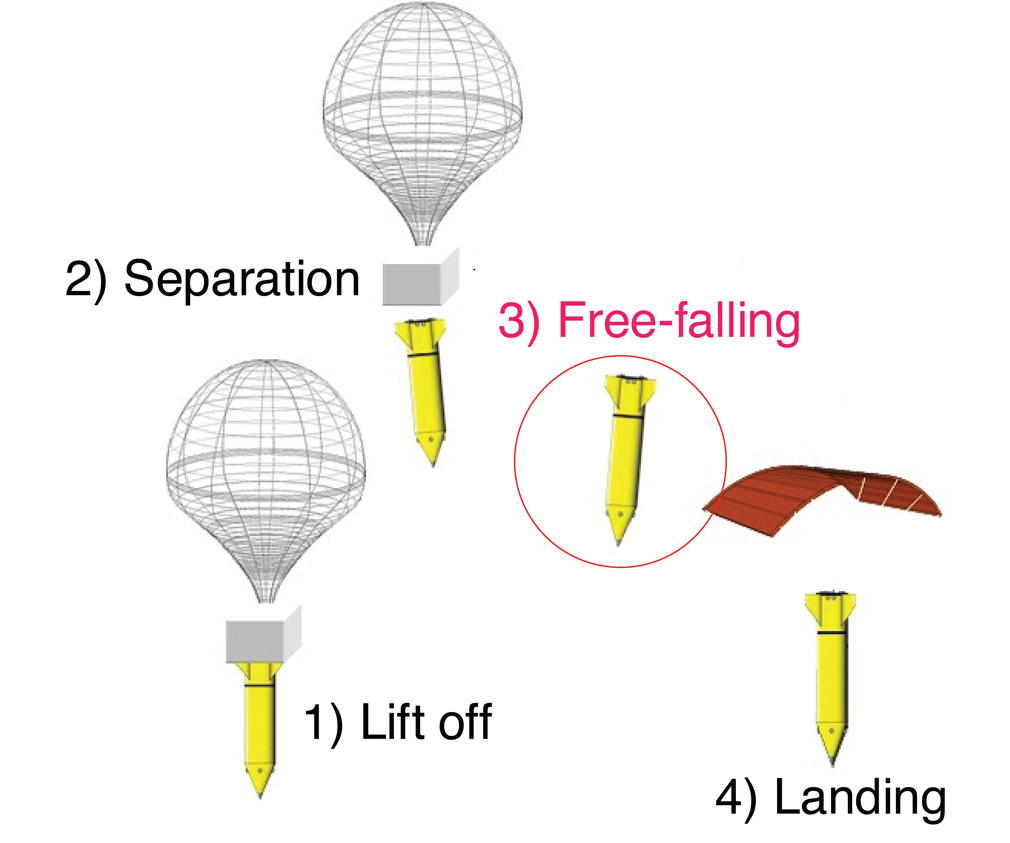 Balloon-Based Operation Vehicle. As previously mentioned, JAXA’s BOV has been designed for microgravity research. The scenario of a microgravity experiment is illustrated in FIGURE 2. The vehicle is launched with a balloon, which carries it to an altitude of more than 40 kilometers, where it is released.