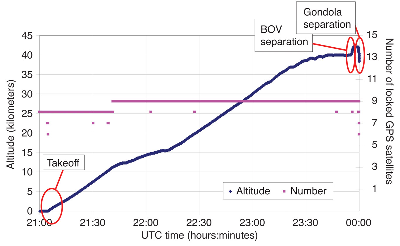Background GPS Experiment. DUT is involved in a precise GPS-based relative positioning and attitude determination experiment onboard the BOV and the gondola of the balloon. Not only is the BOV a challenging environment, but so is the gondola itself, because of the rather rapidly varying attitude (due to wind and — especially at takeoff and separation — rotation) and the high altitude. For a GPS experiment, the altitude of around 40 kilometers is interesting as not many experiments have been performed at this height, which is higher than the altitude reachable by most aircraft but below the low earth orbits for spacecraft. An altitude of about 40 kilometers is a harsh environment for electrical devices because the pressure is about 1/1000 of an atmosphere and the temperature ranges from –60 to 0 degrees Celsius. Furthermore, the antennas are placed under the balloon, which affects the received GPS signals. Later on, we will describe in detail two experiments performed in 2008 and 2009, respectively.