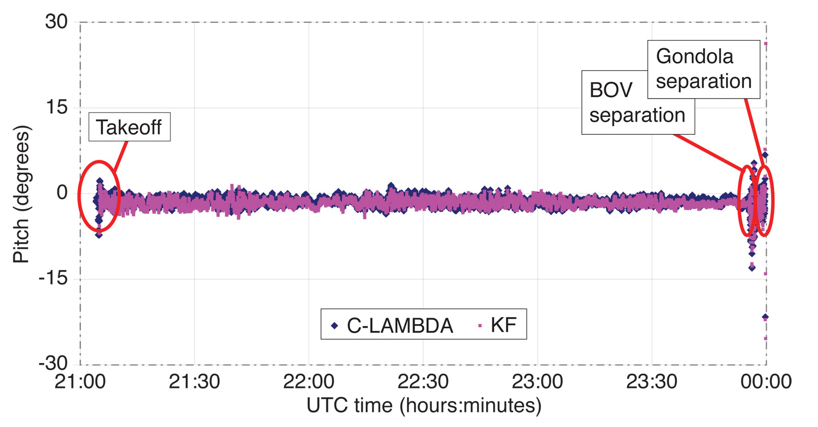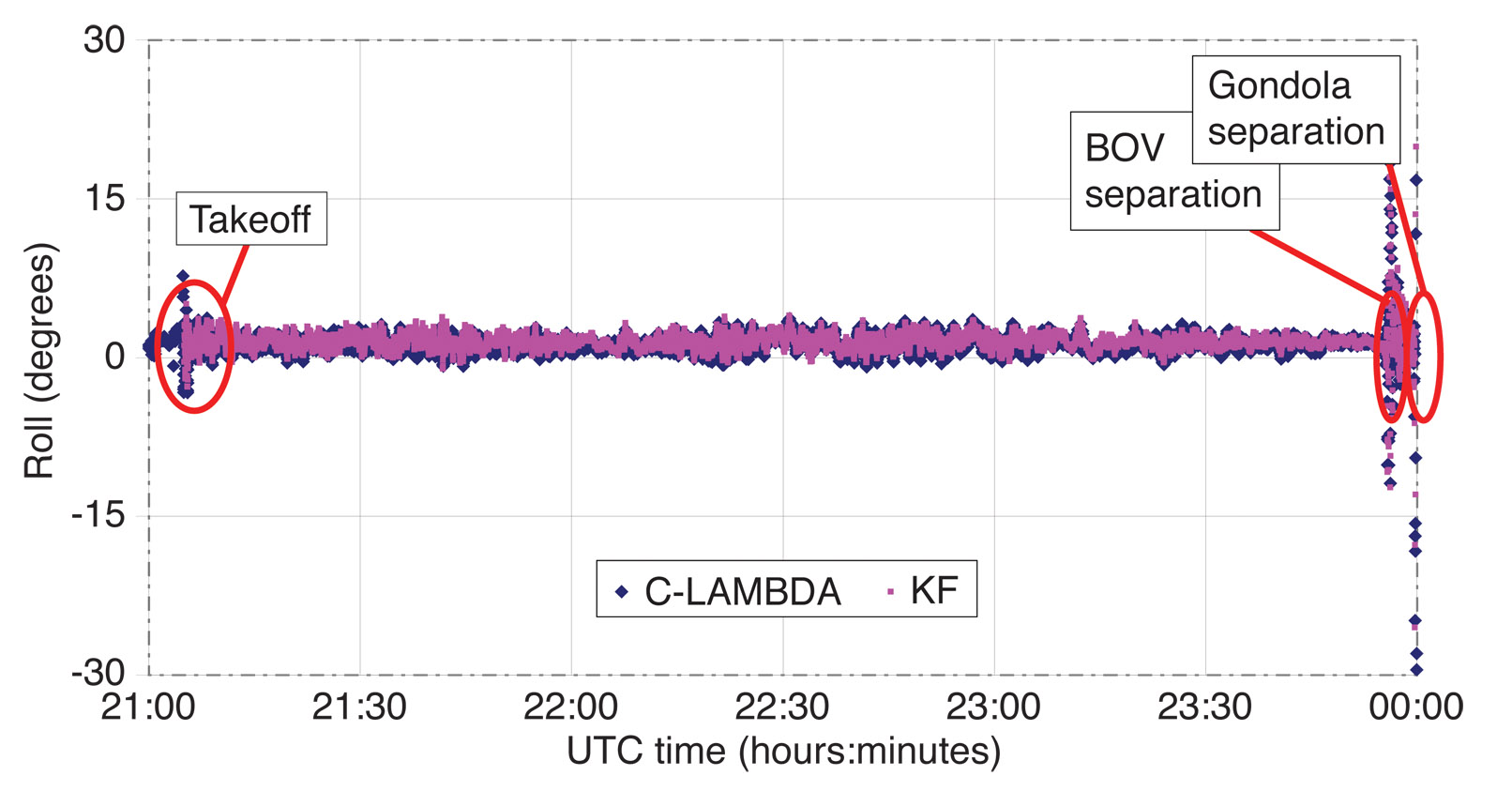 Gondola flight after BOV separation: After the separation of the BOV from the gondola, the gondola starts to ascend and sway. FIGURE 10 contains roll and pitch estimates for this part of the flight until the gondola separation. In the figure, we see large variations in the orientation of the gondola (up to 40 (±20) degrees for roll and 20 (± 10) degrees for pitch). It is interesting that after BOV separation, during the large maneuvers of the gondola caused by the separation, both KF and C-LAMBDA estimates are available but to a certain extent are different. Table 4 also contains standard deviations and biases between C-LAMBDA and KF for this part of the flight.