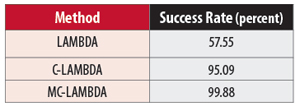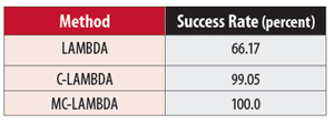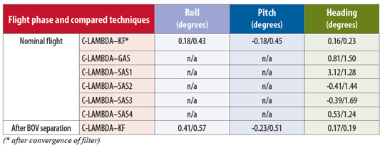 The standard deviation for the difference in the estimates of roll, pitch, and heading is as expected. For the comparison with the other sensors, we use the C-LAMBDA attitude as the reference. Between C-LAMBDA and GAS/SAS, we observe a bias, most likely due to minor misalignment issues between the sensors. The standard deviations in Table 4 are in line with expectation based on the sensor specifications. During this part of the flight, we achieved a single-epoch, single-frequency empirical overall success rate for ambiguity resolution on the two baselines of 95.09 percent. As a reference, we also include in TABLE 5 the success rate for standard LAMBDA using observations from a single epoch. If we make use of the MC-LAMBDA method, the success rate is increased to 99.88 percent as shown in the table. The success rate is higher as the integrated model for all the baselines is stronger.
