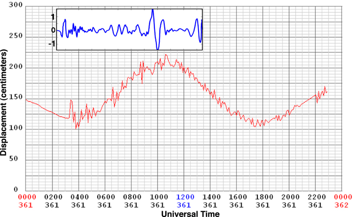Figure 1. The Sumatra tsunami signal measured at the Cocos Islands by the tide gauge (red) and by the co-located GPS receiver (blue). The tide gauge measures the sea-level displacement (tide plus superimposed tsunami) and the GPS receiver measures the slant total electron content perturbation (+/-1 TEC unit) in the ionosphere.
