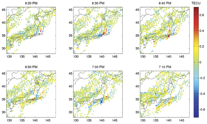 Figure 2. The observed signal for the June 23, 2001, tsunami (initiated offshore Peru). Total electron content variations are plotted at the ionosphere pierce points. A wave-like disturbance is seen propagating toward the coast of Honshu, the main island of Japan.